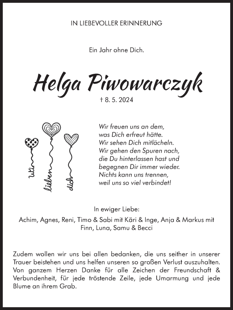 Hier finden Sie alle Traueranzeigen aus der Zeitung, die bisher für Helga Piwowarczyk erschienen sind. Weitere Traueranzeigen, die in der Zeitung erscheinen, werden hier ebenfalls aufgelistet