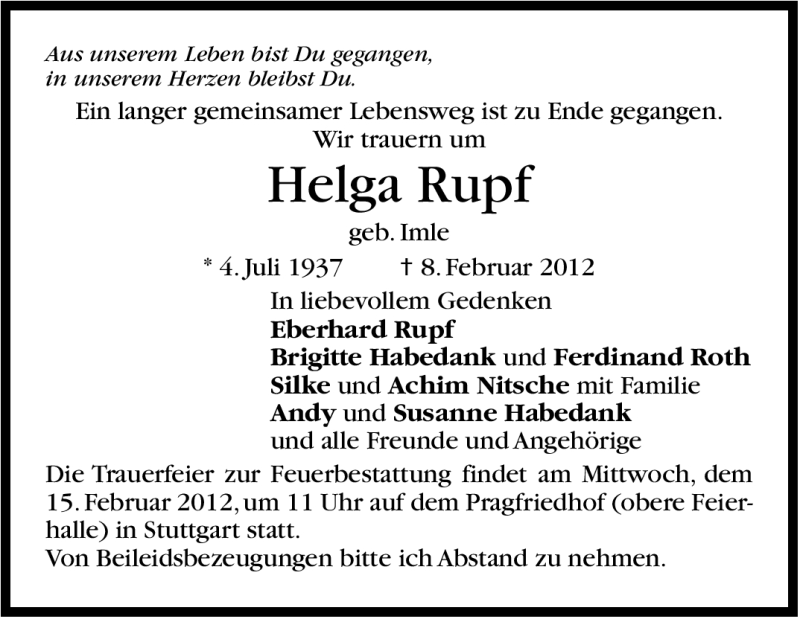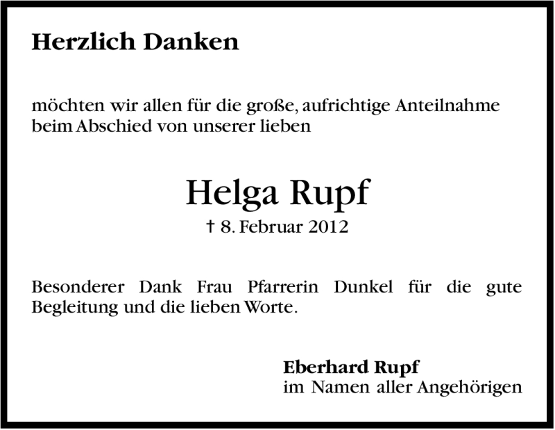 Hier finden Sie alle Traueranzeigen aus der Zeitung, die bisher für Helga Rupf erschienen sind. Weitere Traueranzeigen, die in der Zeitung erscheinen, werden hier ebenfalls aufgelistet