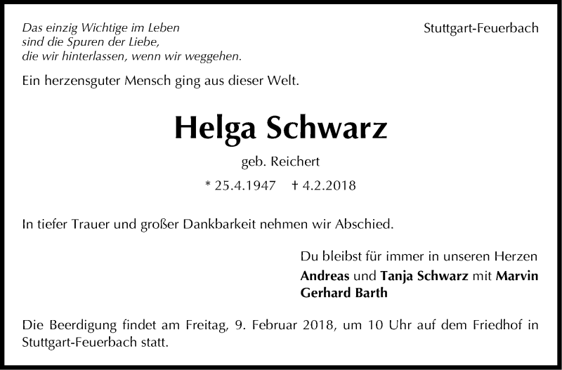 Hier finden Sie alle Traueranzeigen aus der Zeitung, die bisher für Helga Schwarz erschienen sind. Weitere Traueranzeigen, die in der Zeitung erscheinen, werden hier ebenfalls aufgelistet