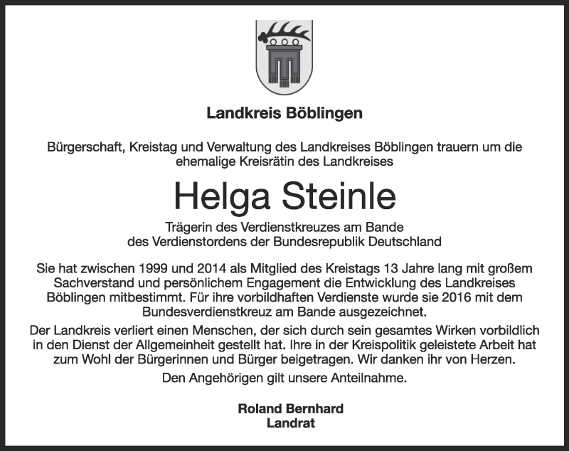Hier finden Sie alle Traueranzeigen aus der Zeitung, die bisher für Helga Steinle erschienen sind. Weitere Traueranzeigen, die in der Zeitung erscheinen, werden hier ebenfalls aufgelistet