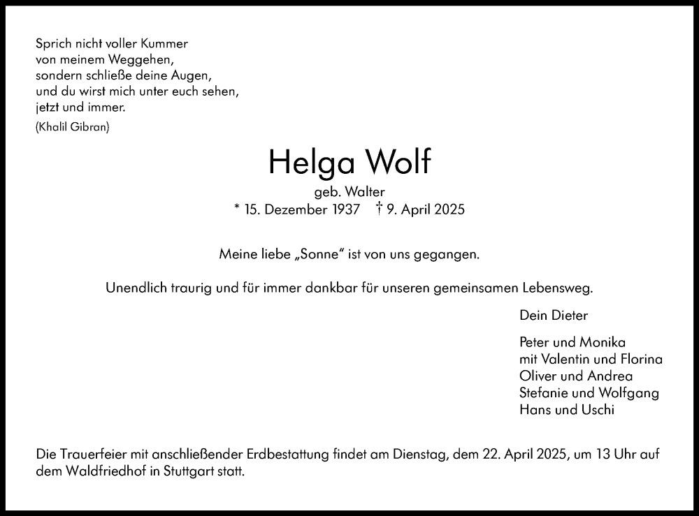 Hier finden Sie alle Traueranzeigen aus der Zeitung, die bisher für Helga Wolf erschienen sind. Weitere Traueranzeigen, die in der Zeitung erscheinen, werden hier ebenfalls aufgelistet
