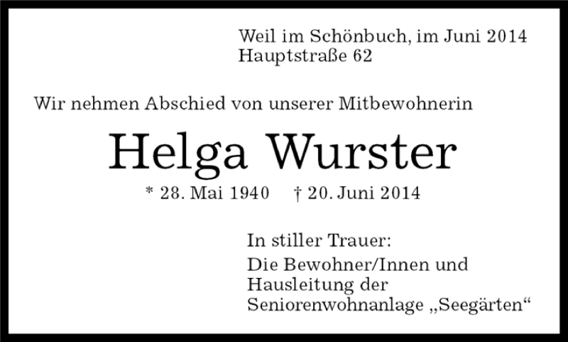 Hier finden Sie alle Traueranzeigen aus der Zeitung, die bisher für Helga Wurster erschienen sind. Weitere Traueranzeigen, die in der Zeitung erscheinen, werden hier ebenfalls aufgelistet