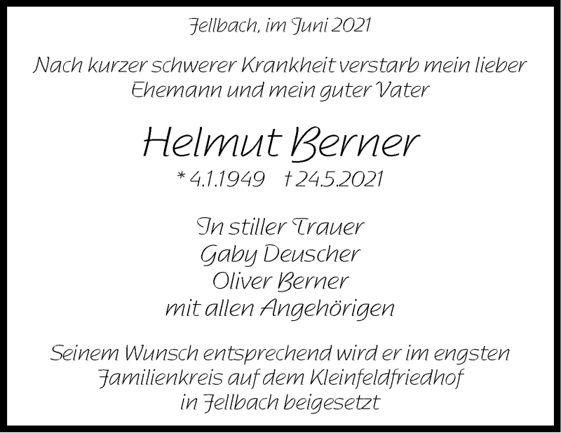 Hier finden Sie alle Traueranzeigen aus der Zeitung, die bisher für Helmut Berner erschienen sind. Weitere Traueranzeigen, die in der Zeitung erscheinen, werden hier ebenfalls aufgelistet