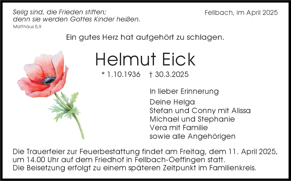 Hier finden Sie alle Traueranzeigen aus der Zeitung, die bisher für Helmut Eick erschienen sind. Weitere Traueranzeigen, die in der Zeitung erscheinen, werden hier ebenfalls aufgelistet