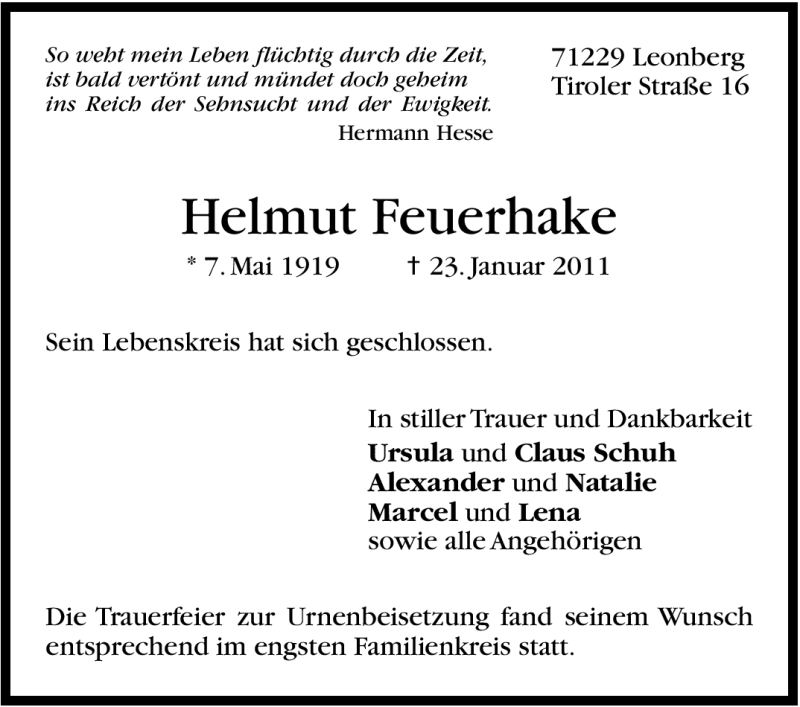 Hier finden Sie alle Traueranzeigen aus der Zeitung, die bisher für Helmut Feuerhake erschienen sind. Weitere Traueranzeigen, die in der Zeitung erscheinen, werden hier ebenfalls aufgelistet
