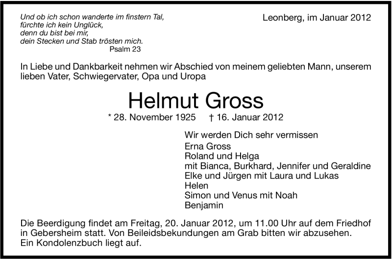Hier finden Sie alle Traueranzeigen aus der Zeitung, die bisher für Helmut Gross erschienen sind. Weitere Traueranzeigen, die in der Zeitung erscheinen, werden hier ebenfalls aufgelistet