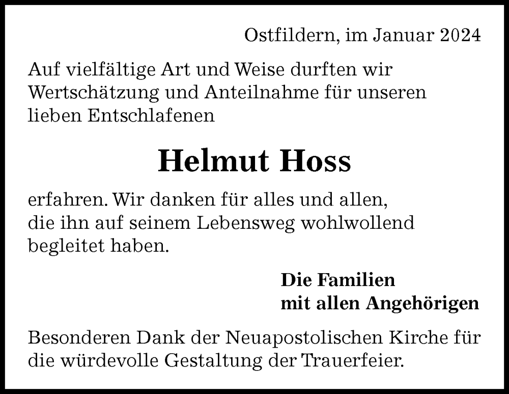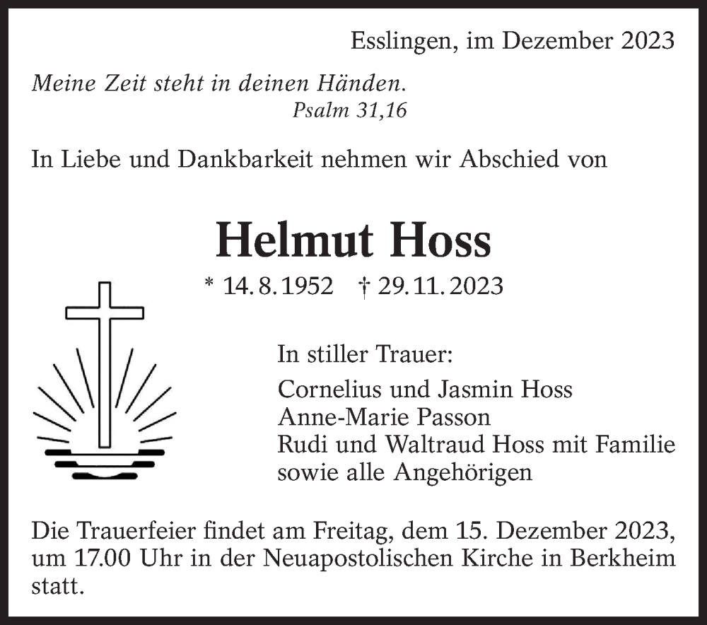Hier finden Sie alle Traueranzeigen aus der Zeitung, die bisher für Helmut Hoss erschienen sind. Weitere Traueranzeigen, die in der Zeitung erscheinen, werden hier ebenfalls aufgelistet