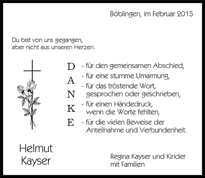 Hier finden Sie alle Traueranzeigen aus der Zeitung, die bisher für Helmut Kayser erschienen sind. Weitere Traueranzeigen, die in der Zeitung erscheinen, werden hier ebenfalls aufgelistet