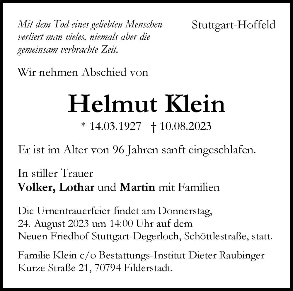 Hier finden Sie alle Traueranzeigen aus der Zeitung, die bisher für Helmut Klein erschienen sind. Weitere Traueranzeigen, die in der Zeitung erscheinen, werden hier ebenfalls aufgelistet