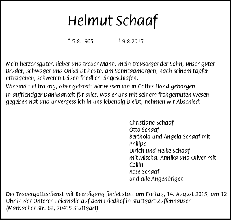 Hier finden Sie alle Traueranzeigen aus der Zeitung, die bisher für Helmut Schaaf erschienen sind. Weitere Traueranzeigen, die in der Zeitung erscheinen, werden hier ebenfalls aufgelistet
