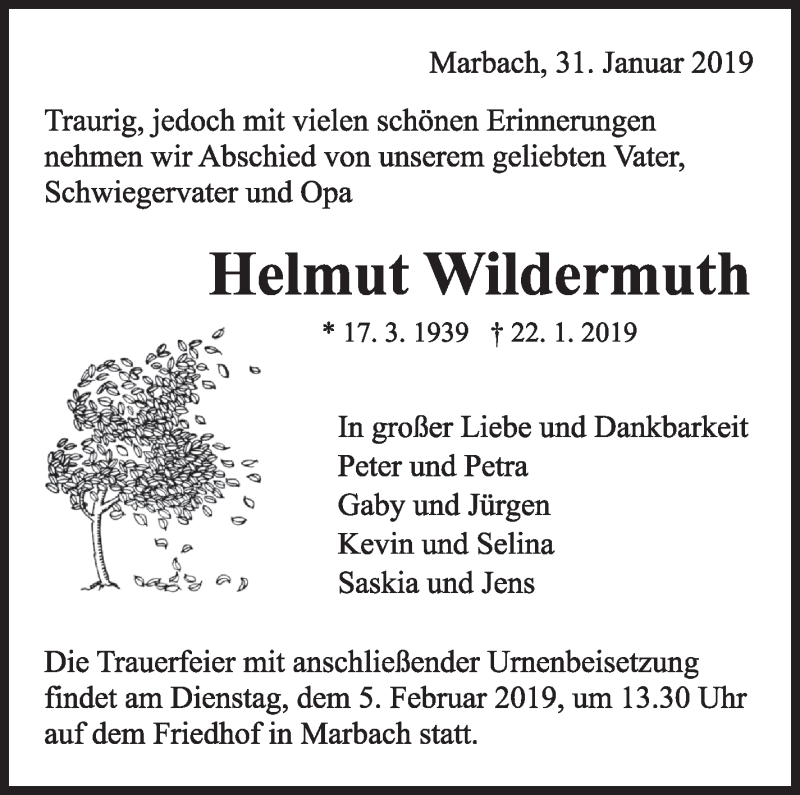 Hier finden Sie alle Traueranzeigen aus der Zeitung, die bisher für Helmut Wildermuth erschienen sind. Weitere Traueranzeigen, die in der Zeitung erscheinen, werden hier ebenfalls aufgelistet