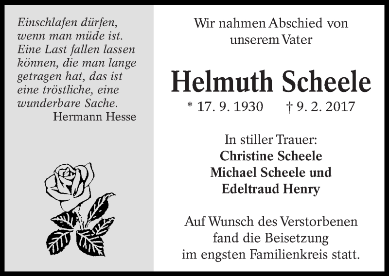 Hier finden Sie alle Traueranzeigen aus der Zeitung, die bisher für Helmuth Scheele erschienen sind. Weitere Traueranzeigen, die in der Zeitung erscheinen, werden hier ebenfalls aufgelistet
