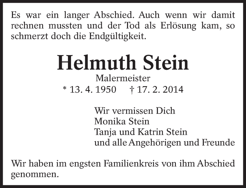 Hier finden Sie alle Traueranzeigen aus der Zeitung, die bisher für Helmuth Stein erschienen sind. Weitere Traueranzeigen, die in der Zeitung erscheinen, werden hier ebenfalls aufgelistet