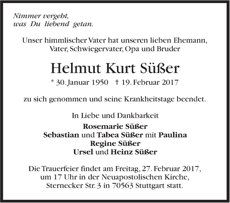 Hier finden Sie alle Traueranzeigen aus der Zeitung, die bisher für Helmut Kurt Süßer erschienen sind. Weitere Traueranzeigen, die in der Zeitung erscheinen, werden hier ebenfalls aufgelistet