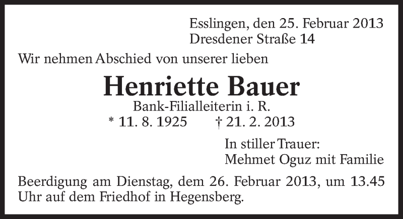 Hier finden Sie alle Traueranzeigen aus der Zeitung, die bisher für Henriette Bauer erschienen sind. Weitere Traueranzeigen, die in der Zeitung erscheinen, werden hier ebenfalls aufgelistet