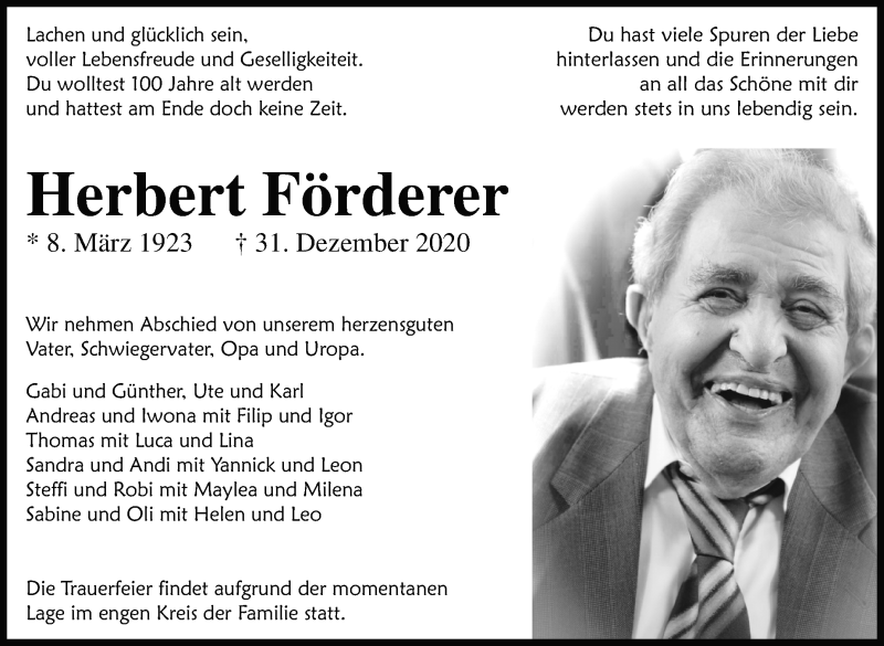 Hier finden Sie alle Traueranzeigen aus der Zeitung, die bisher für Herbert Förderer erschienen sind. Weitere Traueranzeigen, die in der Zeitung erscheinen, werden hier ebenfalls aufgelistet