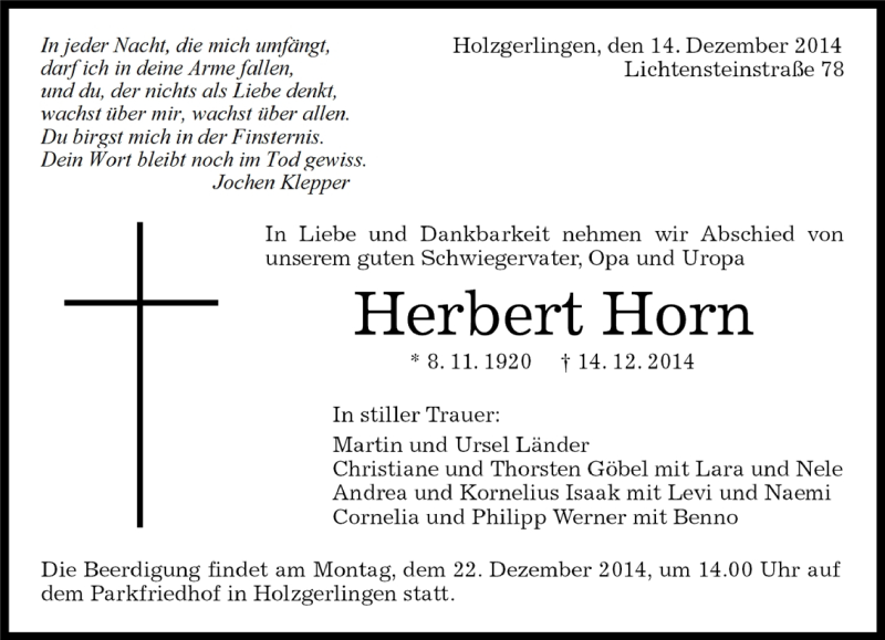 Hier finden Sie alle Traueranzeigen aus der Zeitung, die bisher für Herbert Horn erschienen sind. Weitere Traueranzeigen, die in der Zeitung erscheinen, werden hier ebenfalls aufgelistet