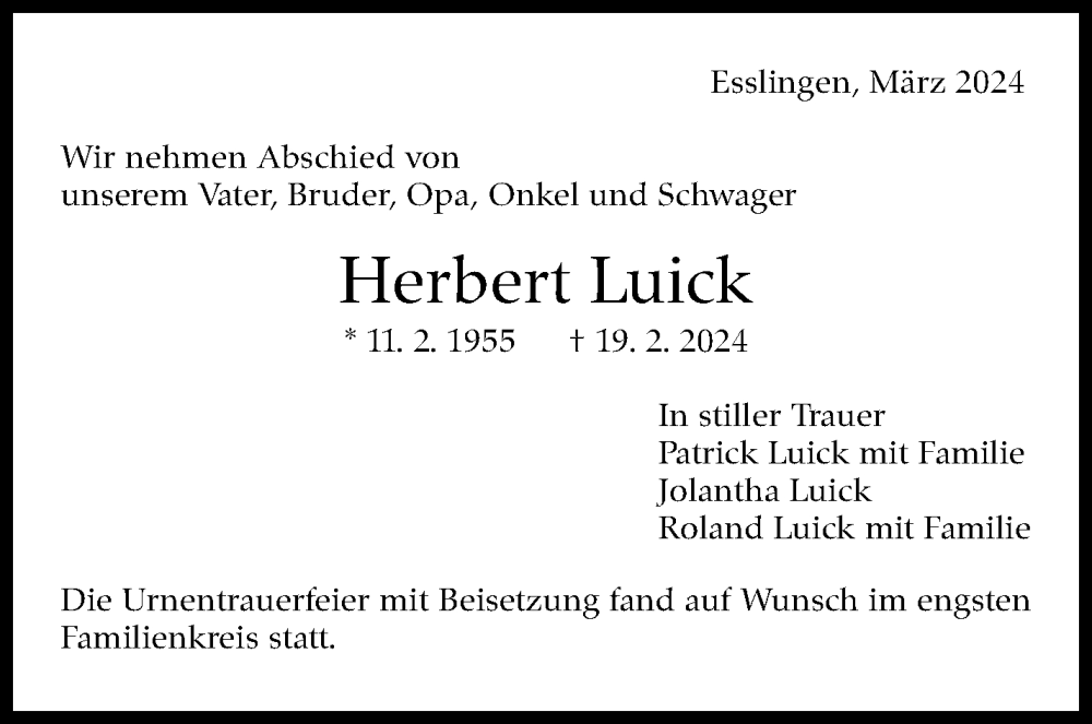 Hier finden Sie alle Traueranzeigen aus der Zeitung, die bisher für Herbert Luick erschienen sind. Weitere Traueranzeigen, die in der Zeitung erscheinen, werden hier ebenfalls aufgelistet