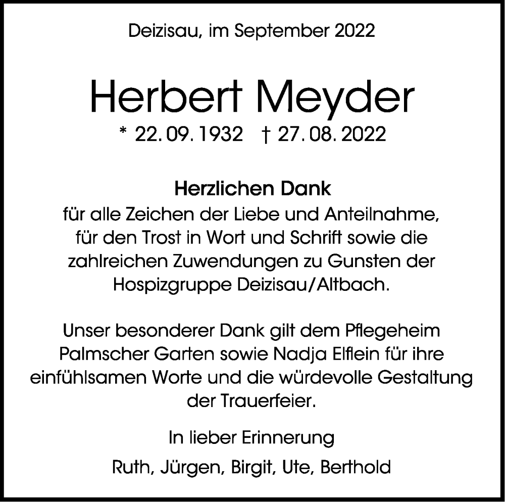 Hier finden Sie alle Traueranzeigen aus der Zeitung, die bisher für Herbert Meyder erschienen sind. Weitere Traueranzeigen, die in der Zeitung erscheinen, werden hier ebenfalls aufgelistet