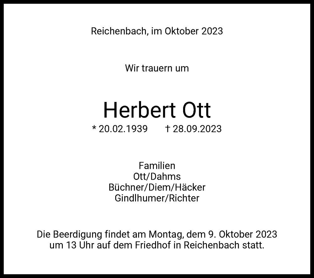 Hier finden Sie alle Traueranzeigen aus der Zeitung, die bisher für Herbert Ott erschienen sind. Weitere Traueranzeigen, die in der Zeitung erscheinen, werden hier ebenfalls aufgelistet