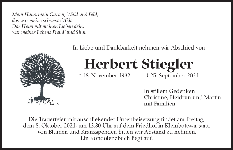 Hier finden Sie alle Traueranzeigen aus der Zeitung, die bisher für Herbert Stiegler erschienen sind. Weitere Traueranzeigen, die in der Zeitung erscheinen, werden hier ebenfalls aufgelistet