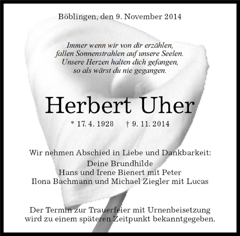 Hier finden Sie alle Traueranzeigen aus der Zeitung, die bisher für Herbert Uher erschienen sind. Weitere Traueranzeigen, die in der Zeitung erscheinen, werden hier ebenfalls aufgelistet