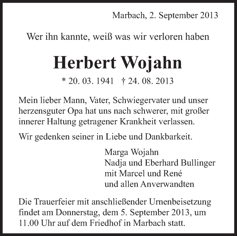 Hier finden Sie alle Traueranzeigen aus der Zeitung, die bisher für Herbert Wojahn erschienen sind. Weitere Traueranzeigen, die in der Zeitung erscheinen, werden hier ebenfalls aufgelistet