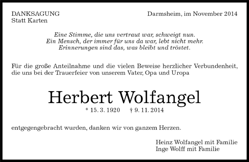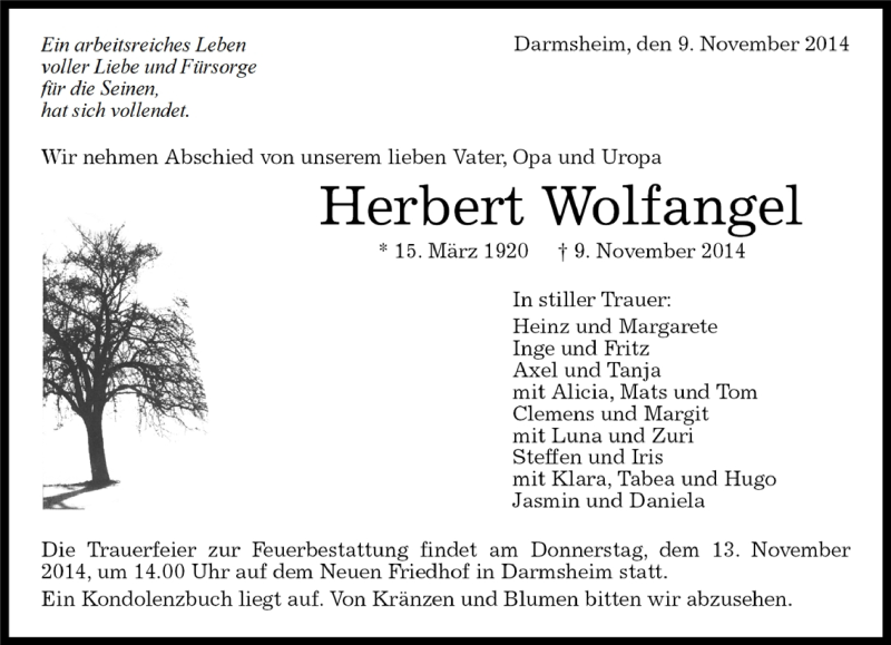 Hier finden Sie alle Traueranzeigen aus der Zeitung, die bisher für Herbert Wolfangel erschienen sind. Weitere Traueranzeigen, die in der Zeitung erscheinen, werden hier ebenfalls aufgelistet