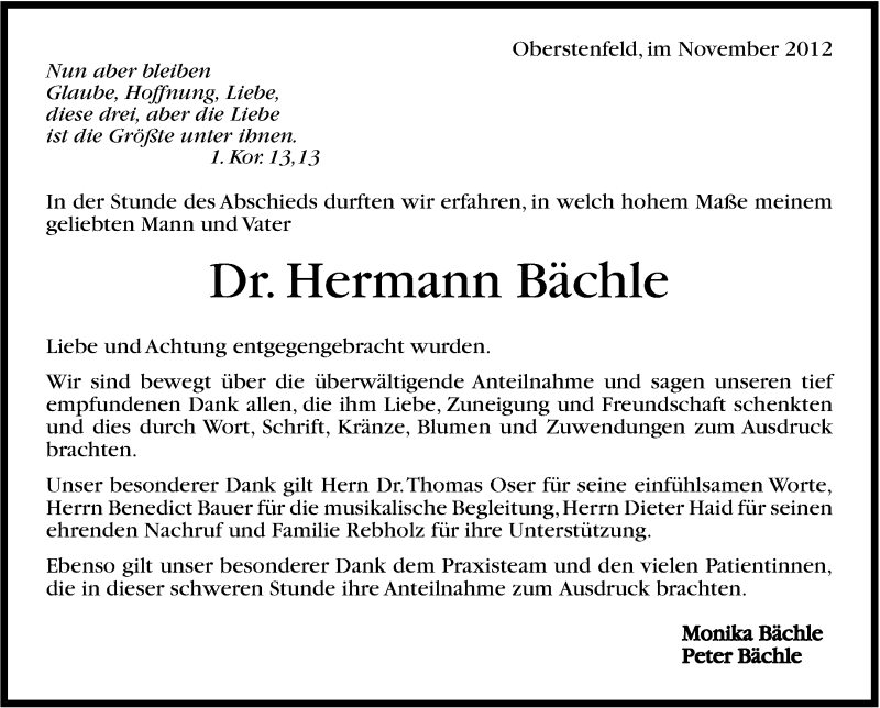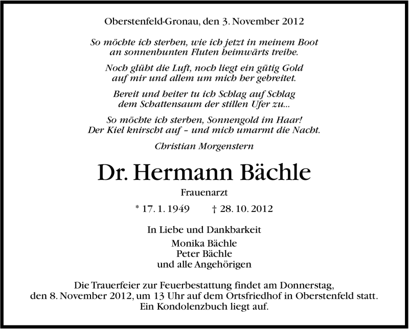 Hier finden Sie alle Traueranzeigen aus der Zeitung, die bisher für Hermann Bächle erschienen sind. Weitere Traueranzeigen, die in der Zeitung erscheinen, werden hier ebenfalls aufgelistet