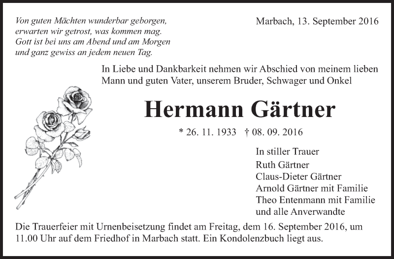 Hier finden Sie alle Traueranzeigen aus der Zeitung, die bisher für Hermann Gärtner erschienen sind. Weitere Traueranzeigen, die in der Zeitung erscheinen, werden hier ebenfalls aufgelistet