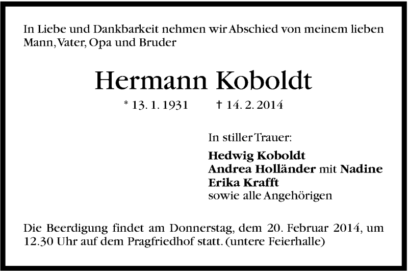 Hier finden Sie alle Traueranzeigen aus der Zeitung, die bisher für Hermann Koboldt erschienen sind. Weitere Traueranzeigen, die in der Zeitung erscheinen, werden hier ebenfalls aufgelistet