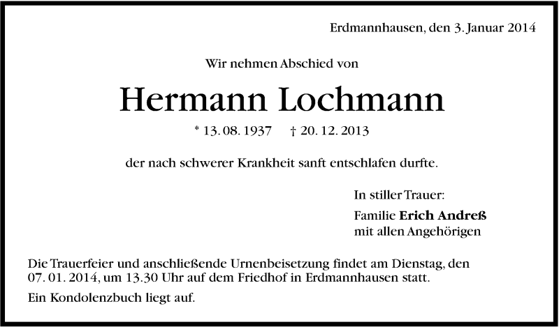 Hier finden Sie alle Traueranzeigen aus der Zeitung, die bisher für Hermann Lochmann erschienen sind. Weitere Traueranzeigen, die in der Zeitung erscheinen, werden hier ebenfalls aufgelistet