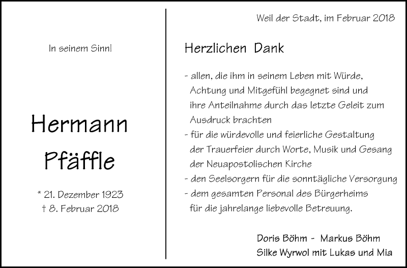 Hier finden Sie alle Traueranzeigen aus der Zeitung, die bisher für Hermann Pfäffle erschienen sind. Weitere Traueranzeigen, die in der Zeitung erscheinen, werden hier ebenfalls aufgelistet