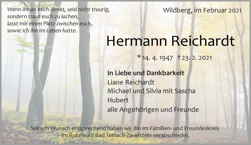 Hier finden Sie alle Traueranzeigen aus der Zeitung, die bisher für Hermann Reichardt erschienen sind. Weitere Traueranzeigen, die in der Zeitung erscheinen, werden hier ebenfalls aufgelistet