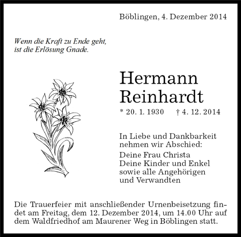 Hier finden Sie alle Traueranzeigen aus der Zeitung, die bisher für Hermann Reinhardt erschienen sind. Weitere Traueranzeigen, die in der Zeitung erscheinen, werden hier ebenfalls aufgelistet