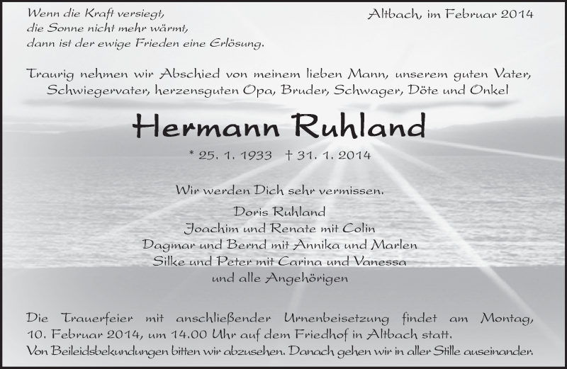 Hier finden Sie alle Traueranzeigen aus der Zeitung, die bisher für Hermann Ruhland erschienen sind. Weitere Traueranzeigen, die in der Zeitung erscheinen, werden hier ebenfalls aufgelistet