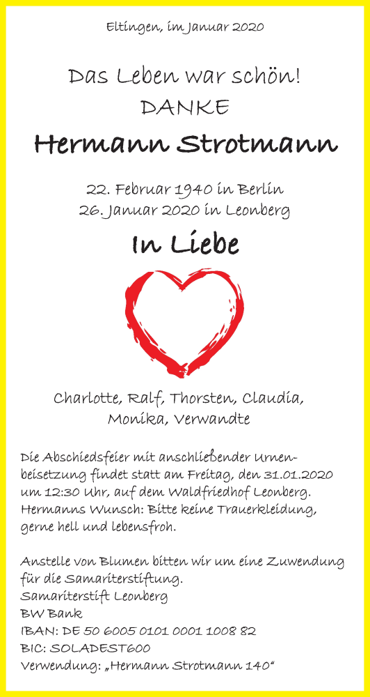 Hier finden Sie alle Traueranzeigen aus der Zeitung, die bisher für Hermann Strotmann erschienen sind. Weitere Traueranzeigen, die in der Zeitung erscheinen, werden hier ebenfalls aufgelistet