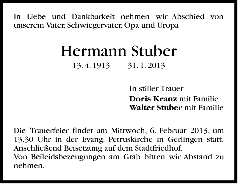 Hier finden Sie alle Traueranzeigen aus der Zeitung, die bisher für Hermann Stuber erschienen sind. Weitere Traueranzeigen, die in der Zeitung erscheinen, werden hier ebenfalls aufgelistet