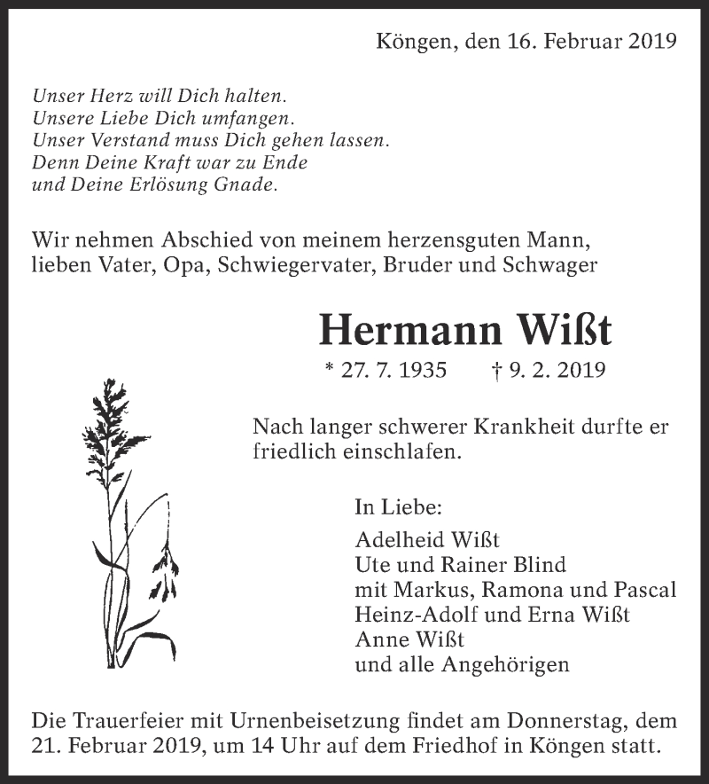 Hier finden Sie alle Traueranzeigen aus der Zeitung, die bisher für Hermann Wißt erschienen sind. Weitere Traueranzeigen, die in der Zeitung erscheinen, werden hier ebenfalls aufgelistet