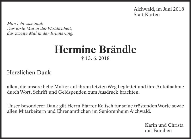 Hier finden Sie alle Traueranzeigen aus der Zeitung, die bisher für Hermine Brändle erschienen sind. Weitere Traueranzeigen, die in der Zeitung erscheinen, werden hier ebenfalls aufgelistet