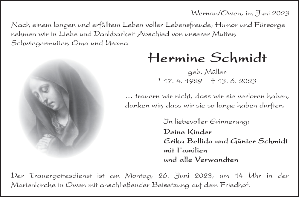 Hier finden Sie alle Traueranzeigen aus der Zeitung, die bisher für Hermine Schmidt erschienen sind. Weitere Traueranzeigen, die in der Zeitung erscheinen, werden hier ebenfalls aufgelistet