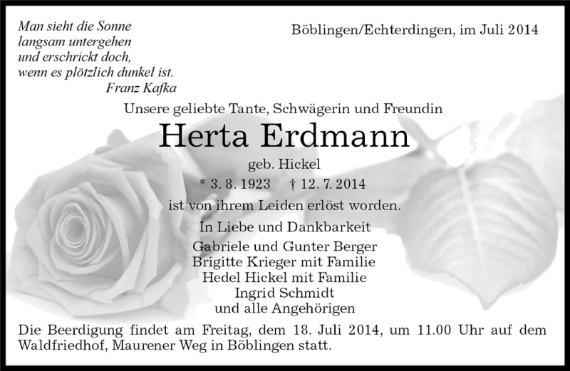 Hier finden Sie alle Traueranzeigen aus der Zeitung, die bisher für Herta Erdmann erschienen sind. Weitere Traueranzeigen, die in der Zeitung erscheinen, werden hier ebenfalls aufgelistet