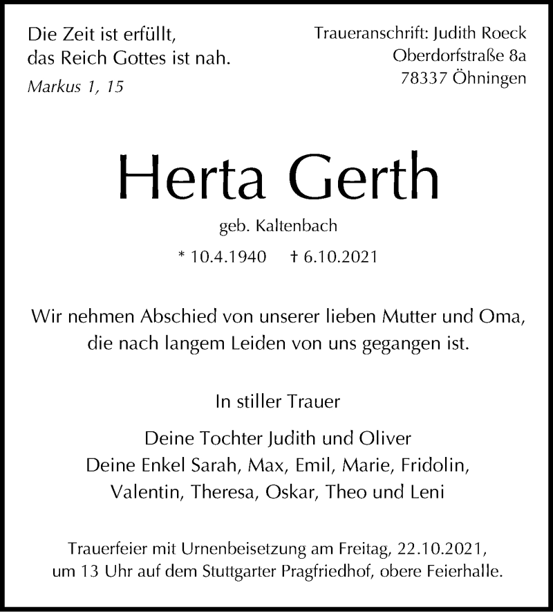 Hier finden Sie alle Traueranzeigen aus der Zeitung, die bisher für Herta Gerth erschienen sind. Weitere Traueranzeigen, die in der Zeitung erscheinen, werden hier ebenfalls aufgelistet