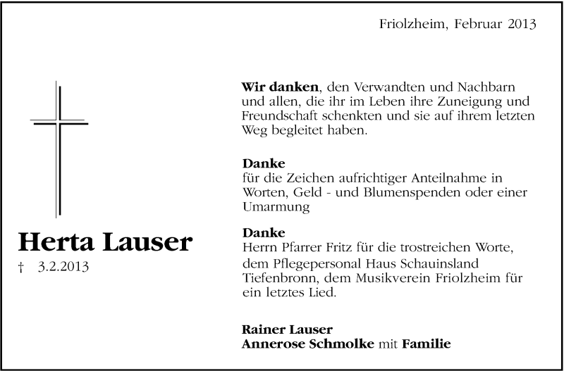 Hier finden Sie alle Traueranzeigen aus der Zeitung, die bisher für Herta Lauser erschienen sind. Weitere Traueranzeigen, die in der Zeitung erscheinen, werden hier ebenfalls aufgelistet