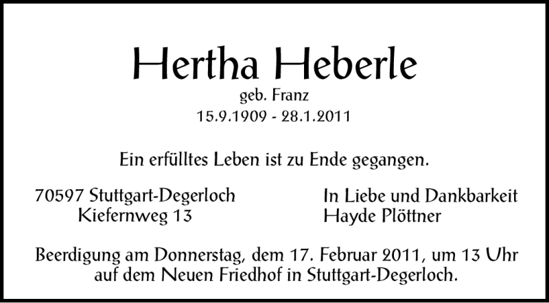Hier finden Sie alle Traueranzeigen aus der Zeitung, die bisher für Hertha Heberle erschienen sind. Weitere Traueranzeigen, die in der Zeitung erscheinen, werden hier ebenfalls aufgelistet