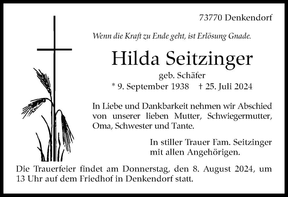 Hier finden Sie alle Traueranzeigen aus der Zeitung, die bisher für Hilda Seitzinger erschienen sind. Weitere Traueranzeigen, die in der Zeitung erscheinen, werden hier ebenfalls aufgelistet