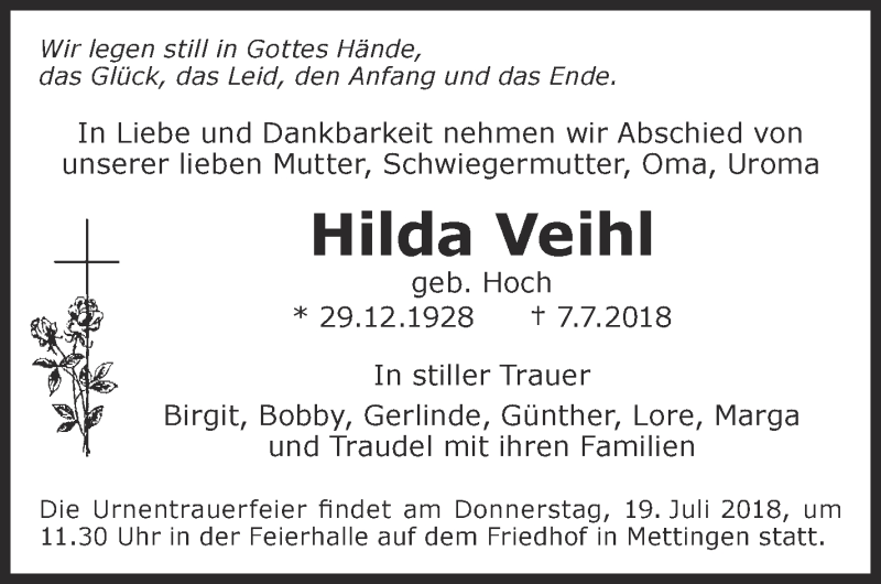 Hier finden Sie alle Traueranzeigen aus der Zeitung, die bisher für Hilda Veihl erschienen sind. Weitere Traueranzeigen, die in der Zeitung erscheinen, werden hier ebenfalls aufgelistet