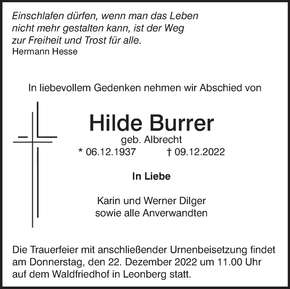 Hier finden Sie alle Traueranzeigen aus der Zeitung, die bisher für Hilde Burrer erschienen sind. Weitere Traueranzeigen, die in der Zeitung erscheinen, werden hier ebenfalls aufgelistet