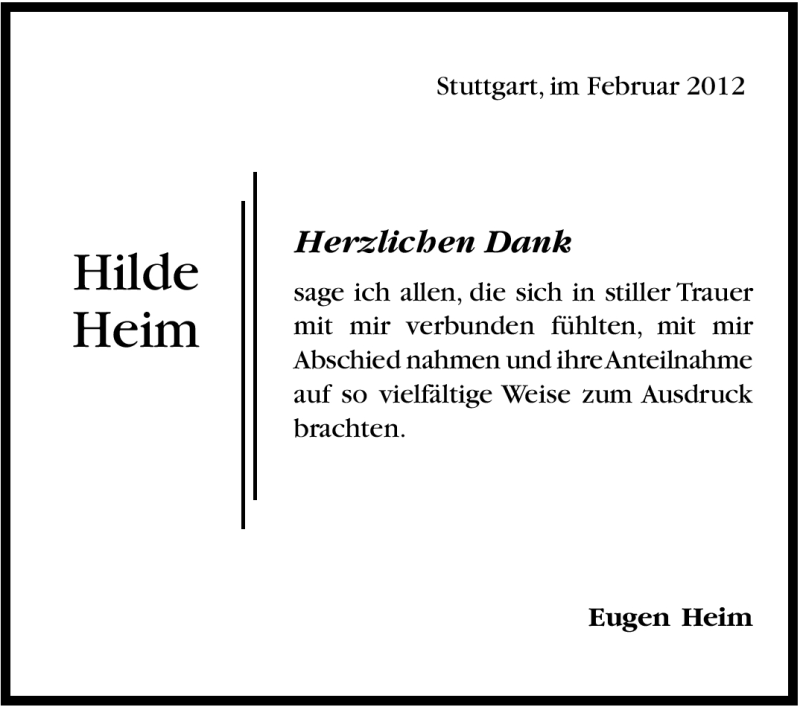 Hier finden Sie alle Traueranzeigen aus der Zeitung, die bisher für Hilde Heim erschienen sind. Weitere Traueranzeigen, die in der Zeitung erscheinen, werden hier ebenfalls aufgelistet