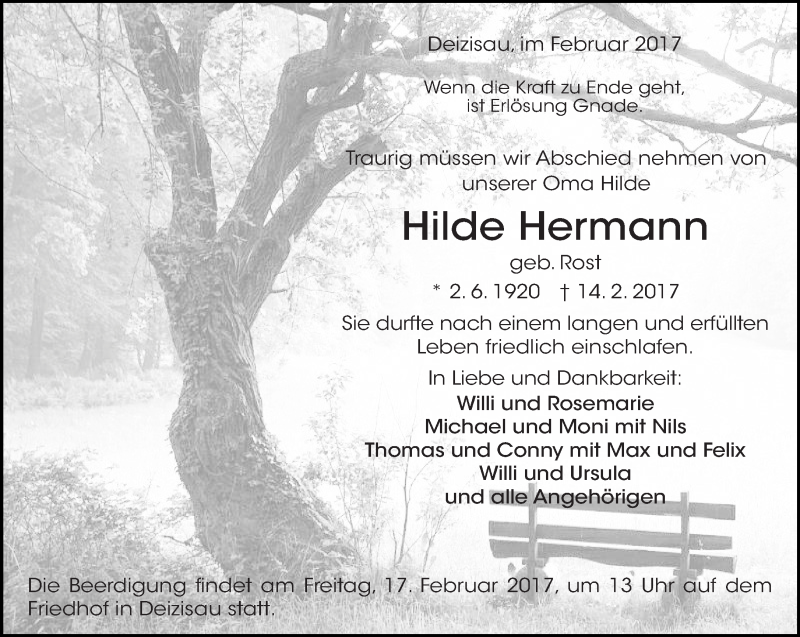 Hier finden Sie alle Traueranzeigen aus der Zeitung, die bisher für Hilde Hermann erschienen sind. Weitere Traueranzeigen, die in der Zeitung erscheinen, werden hier ebenfalls aufgelistet